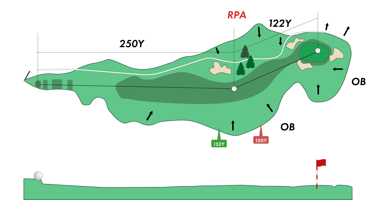 多少左ドックレックしているが、左サイドをねらうと木がスタイミーになりパーオンが難しくなる。